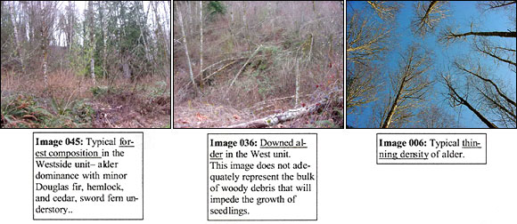 The southeast unit is an uneven aged mixed conifer/hardwood stand with a southeastern facing inclination. Main overstory species are alder, maple, Douglas fir, Western red cedar, Grand fir (Abies grandis), and hemlock. There is no single dominant species. Understory components consist of bitter cherry, Indian plum, Pacific dogwood (Cornus nuttallii), Cascara buck-thorn (Frangula purshiana), sword fern, snowberry, Oregon grape, elderberry, rose, trailing blackberry, salmonberry, and creeping woodsorrel. The tree diameter is varied. The topography is gently sloping. The soil type is Centralia loam, 8-30 % slope.