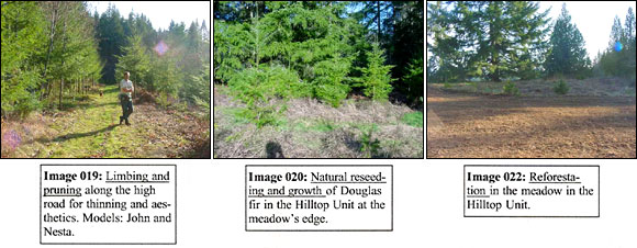 There is little management for timber in this area as is the preference of the landowner. The later-successional forest should be monitored for fire danger and treated if it becomes a problem. Pond creation for woodland wildlife and aesthetics should be considored in the wet marshy area adjacent to the Douglas fir grove. Reforestation in the meadow should be continued (Images 020, 022).