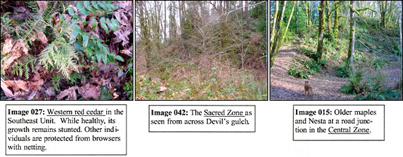 The sacred zone is a small unit embedded in the southeast unit. It is a mixed species uneven-aged stand. The stand is composed primarily of maple with minor elements of alder and Douglas fir. The understory is sword fern dominated. The terrain is moderately sloped, on the far side of the ridge, and east facing. The soil type is Centralia loam, 8-30 % slope. The soil type is primarily conducive to use as woodlot.