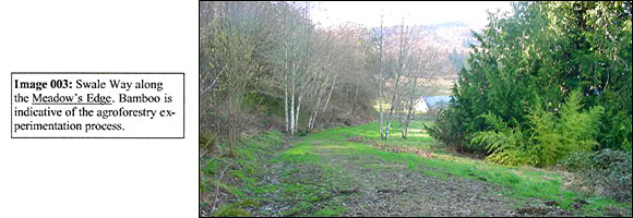 This stand is uneven-aged and under-stocked, consisting of a mix of alder, Western red cedar, Western hemlock (Tsuga heterophylla), and Douglas fir. A considerable amount of all overstory trees are topped. Main overstory species are alder, maple (Acer macrophyla), Douglas fir, Western red cedar, and hemlock. There is no true dominant species at this successional stage, however some large diameter cedar and hemlock were spared in early clearcuts because of their low market value. This unintentionally contributed to the unitís structural integrity. Understory components consist of salal (Gaultheria shallon), bitter cherry (Prunus emarginata), Indian plum, sword fern (Polystichum californicum), deer fern (Blechnum spicant), maidenhair fern (Adiantum pedatum), Oregon grape (Mahonia nervosa), elderberry (Sambucus racemosa), wood rose (Rosa gymnocarpa), trailing blackberry (Rubus ursinus), thimbleberry (Rubus parviflorus), salmonberry (Rubus spectabilis), and creeping woodsorrel (Oxalis corniculata). The tree diameter distribution is fairly uniform. The topography varies but can be steep in areas. This unit is proximate to the bottomlands and comprises the western section of the steep north-facing band that surrounds the farm on three sides. The soil type is Buckpeat silt loam, 30-65% slope. It is best suited for woodland management and Douglas fir cultivation.